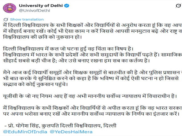 ਨਵੀਂ ਦਿੱਲੀ, 14 ਫਰਵਰੀ - ਦਿੱਲੀ ਯੂਨੀਵਰਸਿਟੀ, ਦੇ ਵਾਈਸ ਚਾਂਸਲਰ ਪ੍ਰੋ. ਯੋਗੇਸ਼ ਸਿੰਘ ਨੇ ਕਿਹਾ, "...ਕੱਲ੍ਹ ਦਿੱਲੀ ਯੂਨੀਵਰਸਿਟੀ ਵਿਚ ਵਾਪਰੀ ਘਟਨਾ ਚਿੰਤਾ ਦਾ ਵਿਸ਼ਾ ਹੈ। ਮੈਂ ਅੱਜ ਕਈ ਵਿਦਿਆਰਥੀ ਸਮੂਹਾਂ ਅਤੇ ਅਧਿਆਪਕਾਂ ਨਾਲ...