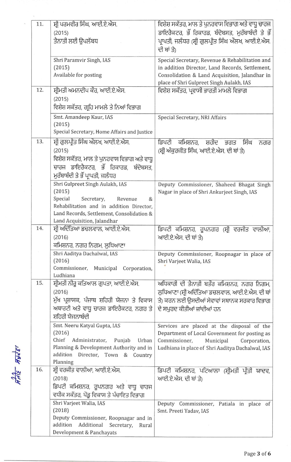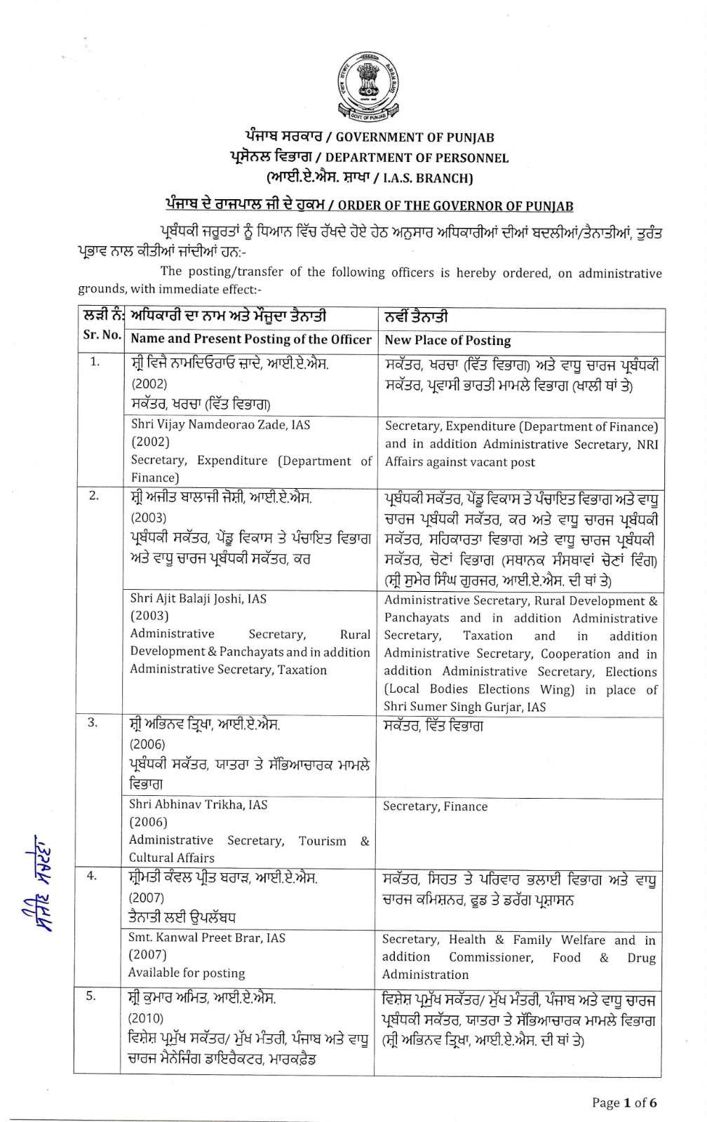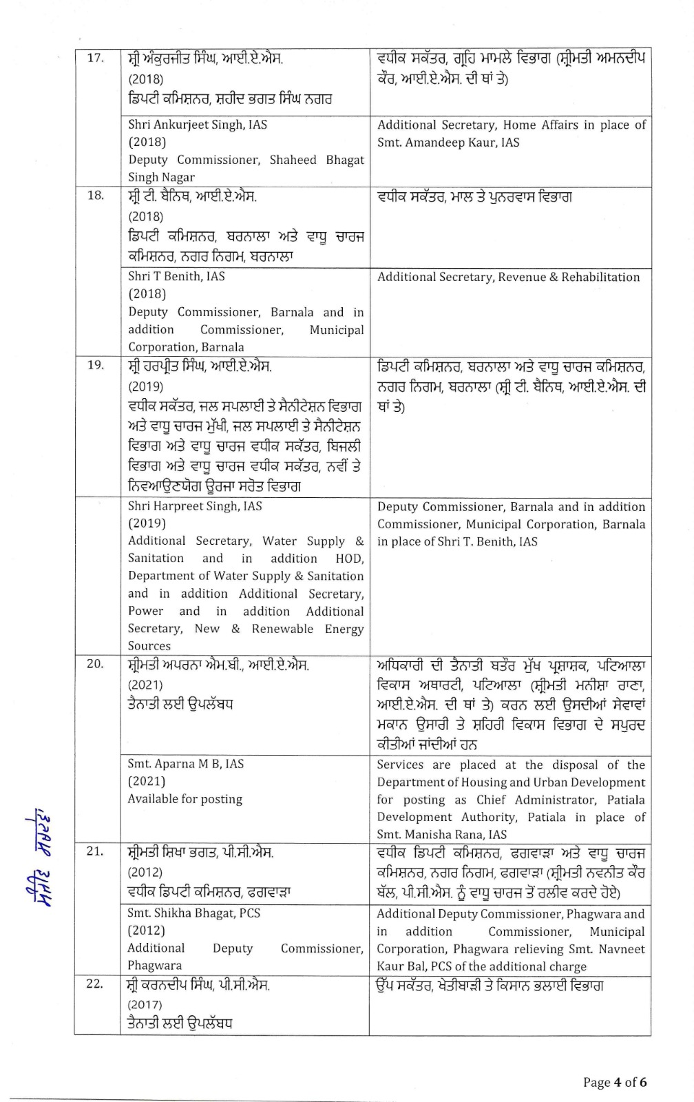 ਪੰਜਾਬ ਸਰਕਾਰ ਵਲੋਂ ਪ੍ਰਸ਼ਾਸਨਿਕ ਅਧਿਕਾਰੀਆਂ ਦੇ ਤਬਾਦਲੇ