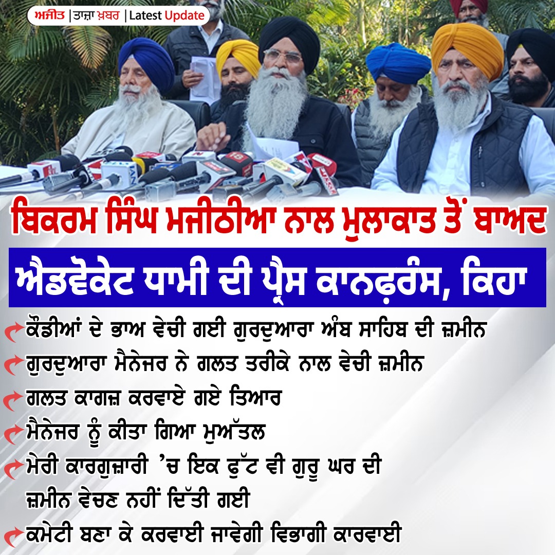 ਇਸ ਤੋਂ ਬਾਅਦ ਪੱਤਰਕਾਰਾਂ ਨਾਲ ਗੱਲ ਕਰਦੇ ਹੋਏ ਐਡਵੋਕੇਟ ਧਾਮੀ ਨੇ ਕਿਹਾ ਕਿ ਮੁਹਾਲੀ ਦੇ ਗੁਰਦੁਆਰਾ ਅੰਬ ਸਾਹਿਬ ਦੀ ਜ਼ਮੀਨ ਜਿਸ ਦੀ ਕੀਮਤ ਕਰੋੜਾਂ ਰੁਪਏ ਸੀ, ਨੂੰ ਕੋਡੀਆਂ ਦੇ ਭਾਅ ਵੇਚ ਦਿੱਤਾ ਗਿਆ ਸੀ। ਉਨ੍ਹਾਂ ਕਿਹਾ ਕਿ ਗੁਰੂ ਘਰ ਦੀ ਕੋਈ ਵੀ ਜ਼ਮੀਨ ਵੇਚਣ ਲਈ ਇਕ ਕਮੇਟੀ ਬਣਾਈ ਜਾਂਦੀ ਹੈ ਤੇ ਕਮੇਟੀ ਸਾਰੀ ਜਾਂਚ ਕਰਕੇ ਹੀ ਜ਼ਮੀਨ ਵੇਚਣ ਦਾ ਕੰਮ ਸ਼ੁਰੂ ਕਰਦੀ ਹੈ। ਉਨ੍ਹਾਂ ਕਿਹਾ ਕਿ ਜ਼ਮੀਨ ਵੇਚਣ ਦਾ ਸਾਰਾ ਕੰਮ ਨਿਯਮਾਂ ਅਨੁਸਾਰ ਕੀਤਾ ਜਾਂਦਾ ਹੈ।ਉਨ੍ਹਾਂ ਅੱਗੇ ਕਿਹਾ ਕਿ ਮੇਰੀ ਕਾਰਗੁਜ਼ਾਰੀ ਦੌਰਾਨ ਇਕ ਫੁੱਟ ਜ਼ਮੀਨ ਵੀ ਗੁਰੂ ਘਰ ਦੀ ਮੈਂ ਵੇਚਣ ਨਹੀਂ ਦਿੱਤੀ।