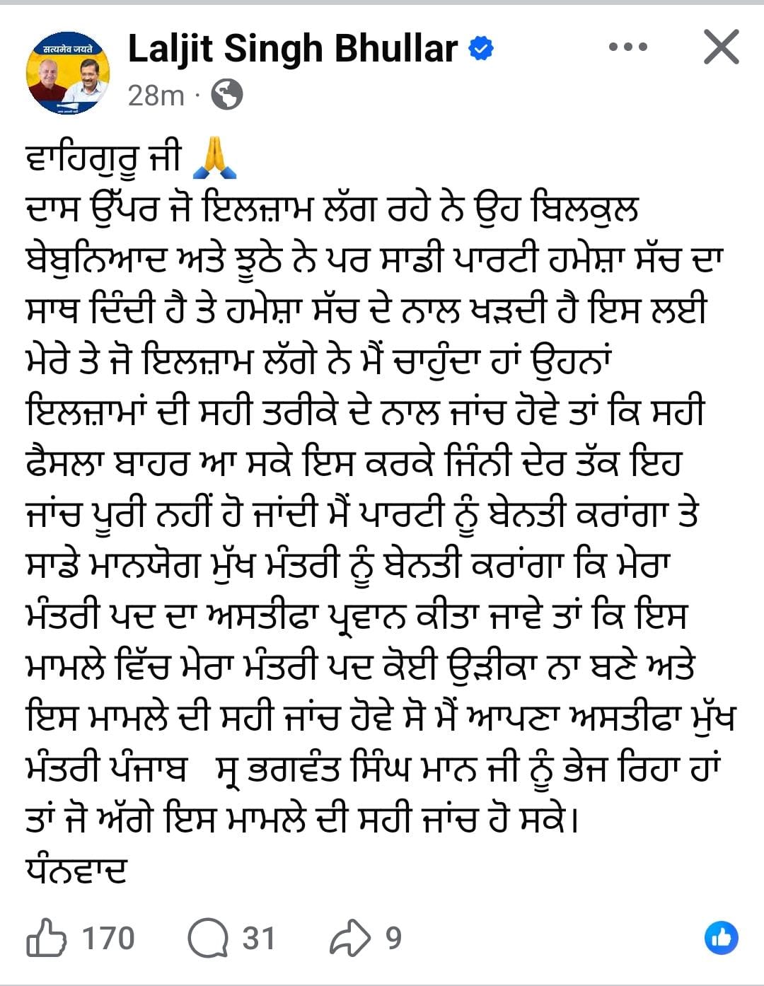 ਉਨ੍ਹਾਂ ਕਿਹਾ ਕਿ ਉਨ੍ਹਾਂ ਦੀ ਪਾਰਟੀ ਹਮੇਸ਼ਾ ਸੱਚ ਨਾਲ ਖੜ੍ਹਦੀ ਹੈ ਤੇ ਸੱਚ ਦਾ ਹੀ ਸਾਥ ਦਿੰਦੀ ਹੈ। ਉਨ੍ਹਾਂ ਕਿਹਾ  ਕਿ ਮੇਰੇ ਉਤੇ ਲੱਗੇ ਸਾਰੇ ਦੋਸ਼ਾਂ ਦੀ ਸਹੀ ਤਰੀਕੇ ਨਾਲ ਜਾਂਚ ਹੋਣੀ ਚਾਹੀਦੀ ਹੈ। ਭੁੱਲਰ ਨੇ ਕਿਹਾ ਕਿ ਮੈਂ ਇਹ ਅਸਤੀਫਾ ਤਾਂ ਦੇਣ ਜਾ ਰਿਹਾ ਹਾਂ ਕਿ ਮੇਰੇ ਉਤੇ ਲੱਗੇ ਦੋਸ਼ਾਂ ਦੀ ਜਾਂਚ ਕਰਨ ਵੇਲੇ ਮੇਰਾ ਮੰਤਰੀ ਅਹੁਦਾ ਵਿਚ ਰੁਕਾਵਟ ਨਾ ਬਣੇ।