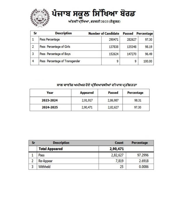 ਪੰਜਾਬ ਸਕੂਲ ਸਿੱਖਿਆ ਬੋਰਡ ਵਲੋਂ ਚੇਅਰਮੈਨ ਡਾ. ਅਮਰਪਾਲ ਸਿੰਘ ਜੀ ਦੀ ਯੋਗ ਅਗਵਾਈ ਹੇਠ ਮਿਤੀ 04.04.2025 ਨੂੰ ਅਕਾਦਮਿਕ ਸਾਲ 2024-2025 ਅੱਠਵੀਂ ਸ਼੍ਰੇਣੀ ਦਾ ਨਤੀਜਾ ਘੋਸ਼ਿਤ ਕੀਤਾ ਗਿਆ। ਇਸ ਸਾਲ ਅੱਠਵੀਂ ਸ਼੍ਰੇਣੀ ਦੀ ਪ੍ਰੀਖਿਆ ਵਿਚ ਕੁੱਲ 10471 ਸਕੂਲਾਂ ਦੇ 290471 (ਦੋ ਲੱਖ ਨੱਬੇ ਹਜ਼ਾਰ ਚਾਰ ਸੌ ਇਕੱਤਰ) ਪ੍ਰੀਖਿਆਰਥੀ ਪ੍ਰੀਖਿਆ ਵਿਚ ਅਪੀਅਰ ਹੋਏ, ਜਿਨ੍ਹਾਂ ਵਿਚੋਂ 282627 (ਦੋ ਲੱਖ ਬਿਆਸੀ ਹਜ਼ਾਰ ਛੇ ਸੌ ਸਤਾਈ) ਪ੍ਰਮੋਟ ਹੋਏ ਅਤੇ ਇਸ ਨਤੀਜੇ ਦੀ ਪਾਸ ਪ੍ਰਤੀਸ਼ਤਤਾ 97.30 ਰਹੀ ਹੈ।