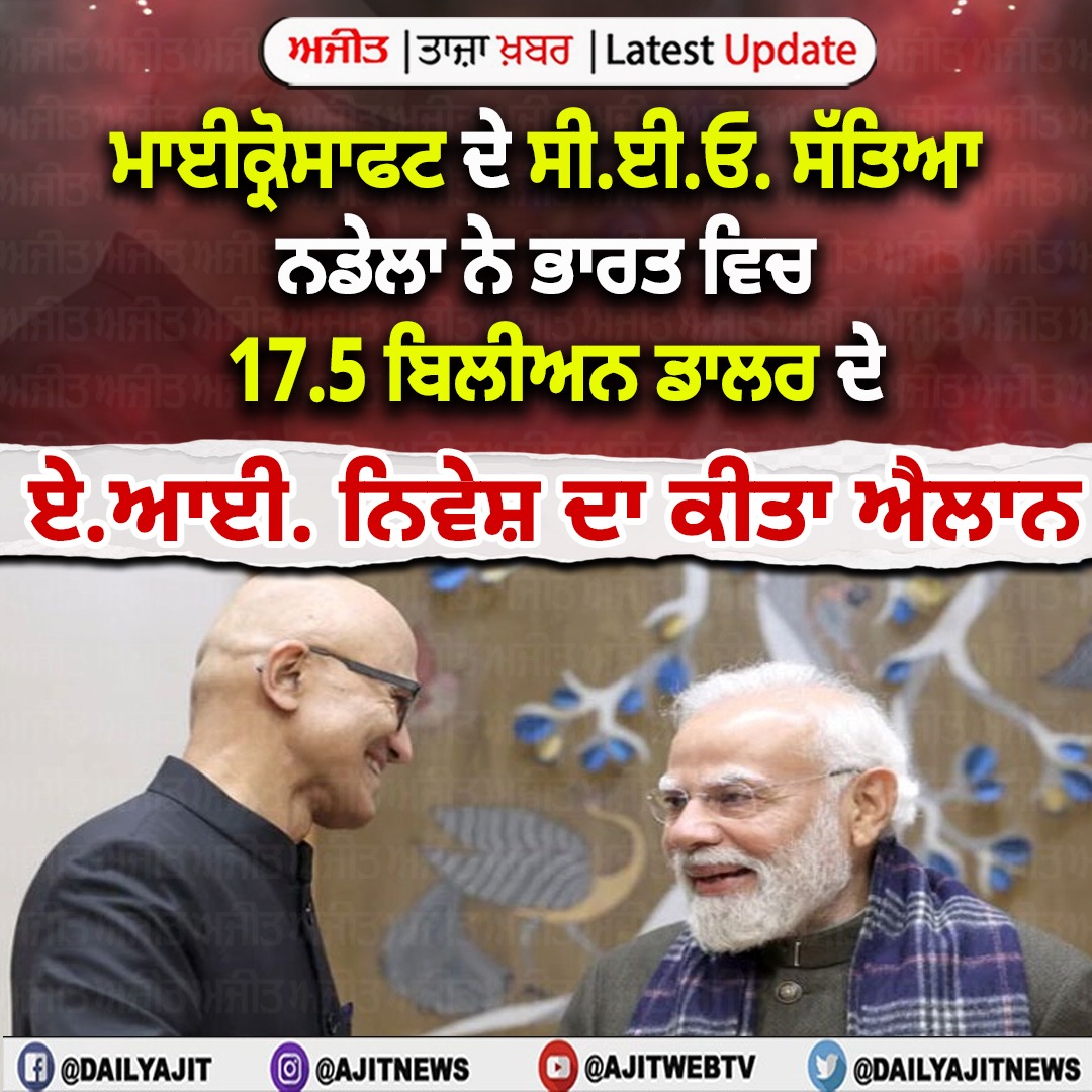 ਮਾਈਕ੍ਰੋਸਾਫਟ ਦੇ ਸੀ.ਈ.ਓ. ਸੱਤਿਆ ਨਡੇਲਾ ਨੇ ਭਾਰਤ ਵਿਚ 17.5 ਬਿਲੀਅਨ ਡਾਲਰ ਦੇ ਏ.ਆਈ. ਨਿਵੇਸ਼ ਦਾ ਕੀਤਾ ਐਲਾਨ