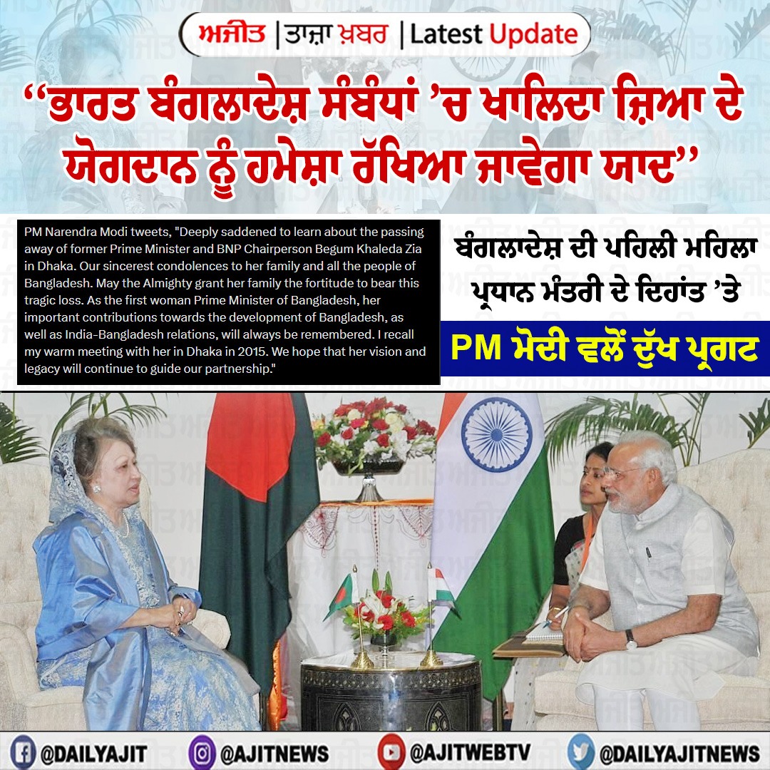 ਬੰਗਲਾਦੇਸ਼ ਦੀ ਪਹਿਲੀ ਮਹਿਲਾ ਪ੍ਰਧਾਨ ਮੰਤਰੀ ਖਾਲਿਦਾ ਜ਼ਿਆ ਦਾ ਦਿਹਾਂਤ