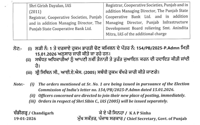 ਚੰਡੀਗੜ੍ਹ, 19 ਜਨਵਰੀ - ਪੰਜਾਬ ਸਰਕਾਰ ਨੇ ਵੱਡੇ ਪੱਧਰ 'ਤੇ ਪ੍ਰਸ਼ਾਸਨਿਕ ਅਧਿਕਾਰੀਆਂ ਦੇ ਤਬਾਦਲੇ ਕੀਤੇ ਹਨ। ਦੇਖੋ ਪੂਰੀ ਡਿਟੇਲ...