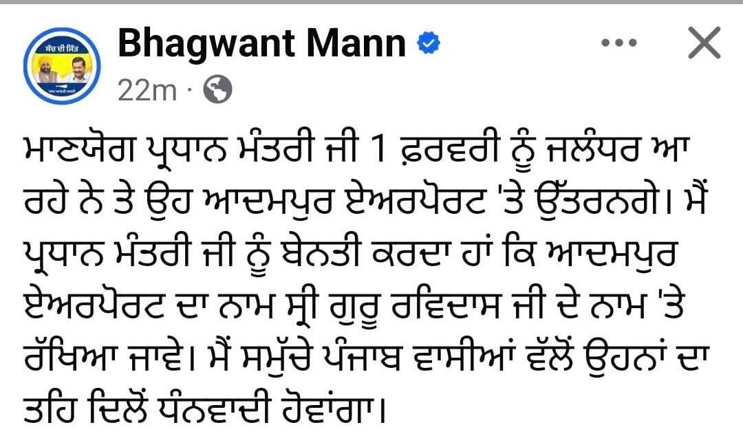 ਉਨ੍ਹਾਂ ਨੇ ਸੋਸ਼ਲ ਮੀਡੀਆ ਉਤੇ ਪਾਈ ਇਕ ਪੋਸਟ ਵਿਚ ਲਿਖਿਆ ਹੈ ਕਿ ਪ੍ਰਧਾਨ ਮੰਤਰੀ ਨਰਿੰਦਰ ਮੋਦੀ 1 ਫਰਵਰੀ ਨੂੰ ਆਦਮਪੁਰ ਏਅਰਪੋਰਟ ਉਤੇ ਉਤਰ ਰਹੇ ਹਨ। ਉਨ੍ਹਾਂ ਅੱਗੇ ਲਿਖਿਆ ਹੈ ਕਿ ਉਹ ਪ੍ਰਧਾਨ ਮੰਤਰੀ ਜੀ ਨੂੰ ਬੇਨਤੀ ਕਰਦੇ ਹਨ ਕਿ ਆਦਮਪੁਰ ਏਅਰਪੋਰਟ ਦਾ ਨਾਂ ਬਦਲ ਕੇ ਸ੍ਰੀ ਗੁਰੂ ਰਵਿਦਾਸ ਜੀ ਦੇ ਨਾਂ ਉਤੇ ਰੱਖਿਆ ਜਾਵੇ। ਇਸ ਲਈ ਉਹ ਸਮੁੱਚੇ ਪੰਜਾਬ ਵਾਸੀਆਂ ਵਲੋਂ ਉਨ੍ਹਾਂ ਦੇ ਤਹਿ ਦਿਲੋਂ ਧੰਨਵਾਦੀ ਹੋਣਗੇ।