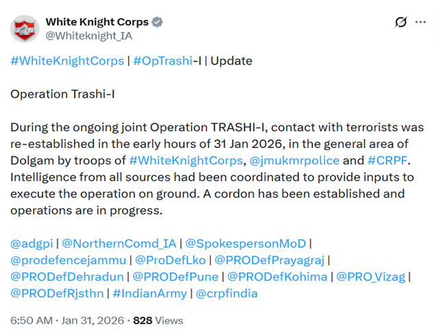 ਸ੍ਰੀਨਗਰ, 31 ਜਨਵਰੀ - ਜੰਮੂ-ਕਸ਼ਮੀਰ ਦੇ ਕਿਸ਼ਤਵਾੜ ਵਿਚ ਇਕ ਵਾਰ ਫਿਰ ਸੁਰੱਖਿਆ ਬਲਾਂ ਅਤੇ ਅੱਤਵਾਦੀਆਂ ਵਿਚਕਾਰ ਗੋਲੀਬਾਰੀ ਹੋਈ ਹੈ। ਕਿਸ਼ਤਵਾੜ ਦੇ ਡੋਲਗਾਮ ਖੇਤਰ ਵਿਚ ਲੁਕੇ ਅੱਤਵਾਦੀਆਂ ਨਾਲ ਸੰਪਰਕ ਮੁੜ ਸਥਾਪਿਤ ਹੋ ਗਿਆ ਤੇ ਮੁਕਾਬਲਾ ਜਾਰੀ ਹੈ। ਅੱਜ ਸਵੇਰ ਵ੍ਹਾਈਟ ਨਾਈਟ ਕੋਰ, ਜੰਮੂ-ਕਸ਼ਮੀਰ ਪੁਲਿਸ ਅਤੇ ਸੀ.ਆਰ.ਪੀ.ਐਫ਼. ਦੇ ਜਵਾਨਾਂ ਨੇ ਡੋਲਗਾਮ ਖੇਤਰ ਵਿਚ ਅੱਤਵਾਦੀਆਂ ਨਾਲ ਦੁਬਾਰਾ ਸੰਪਰਕ ਸਥਾਪਤ ਕੀਤਾ। ਵ੍ਹਾਈਟ ਨਾਈਟ ਕੋਰ ਦੇ ਅਨੁਸਾਰ ਸੰਯੁਕਤ ਆਪ੍ਰੇਸ਼ਨ ਤ੍ਰਾਸ਼ੀ-1 ਨੇ ਇਕ ਘੇਰਾਬੰਦੀ ਸਥਾਪਤ ਕੀਤੀ ਹੈ ਅਤੇ ਕਾਰਵਾਈ ਜਾਰੀ ਹੈ। ਵ੍ਹਾਈਟ ਨਾਈਟ ਕੋਰ ਨੇ ਐਕਸ 'ਤੇ ਦੱਸਿਆ ਕਿ ਚੱਲ ਰਹੇ ਸੰਯੁਕਤ ਆਪ੍ਰੇਸ਼ਨ ਤ੍ਰਾਸ਼ੀ-1 ਦੌਰਾਨ ਵ੍ਹਾਈਟ ਨਾਈਟ ਕੋਰ, ਜੰਮੂ-ਕਸ਼ਮੀਰ ਪੁਲਿਸ ਅਤੇ ਸੀ.ਆਰ.ਪੀ.ਐਫ਼. ਦੇ ਜਵਾਨਾਂ ਨੇ 31 ਜਨਵਰੀ ਦੀ ਸਵੇਰ ਨੂੰ ਡੋਲਗਾਮ ਦੇ ਜਨਰਲ ਖੇਤਰ ਵਿਚ ਅੱਤਵਾਦੀਆਂ ਨਾਲ ਦੁਬਾਰਾ ਸੰਪਰਕ ਸਥਾਪਤ ਕੀਤਾ ਹੈ।
