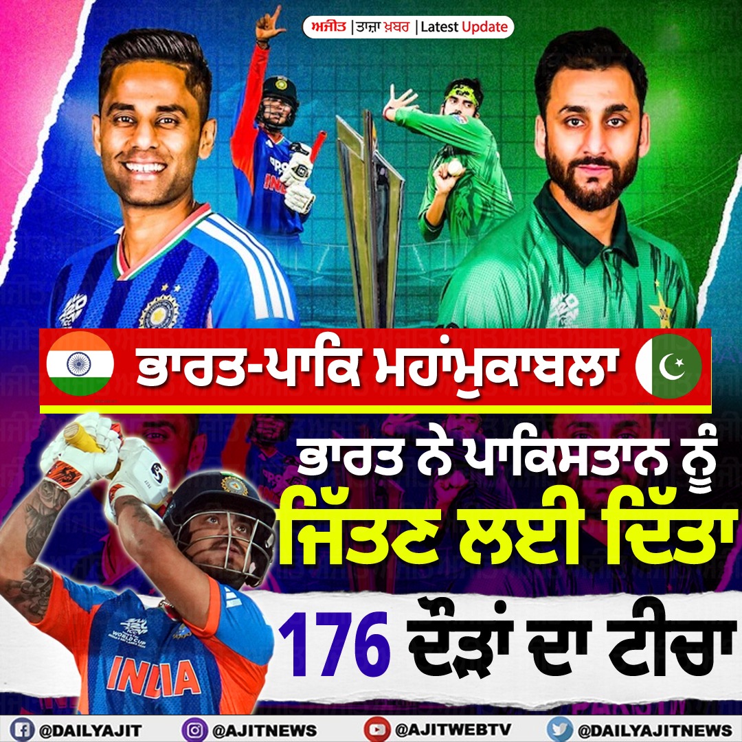 ਤਾਜ਼ਾ ਖ਼ਬਰਾਂ ਟੀ-20 ਵਿਸ਼ਵ ਕੱਪ ਭਾਰਤ-ਪਾਕਿ ਮਹਾਂਮੁਕਾਬਲਾ : ਭਾਰਤ ਦੀ ਪਹਿਲੀ ਵਿਕਟ ਡਿੱਗੀ, ਅਭਿਸ਼ੇਕ ਸ਼ਰਮਾ ਬਿਨਾਂ ਕੋਈ ਦੌੜ ਬਣਾਏ ਆਊਟ 1 hours 48 minutes ago