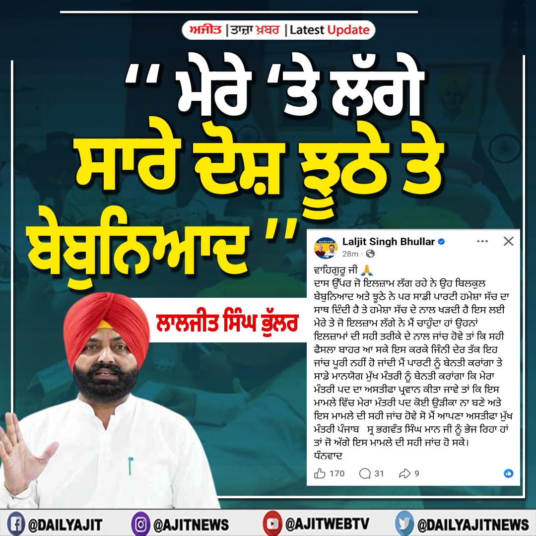 ਚੰਡੀਗੜ੍ਹ, 21 ਮਾਰਚ- ਟਰਾਂਸਪੋਰਟ ਮੰਤਰੀ ਲਾਲਜੀਤ ਸਿੰਘ ਭੁੱਲਰ ਨੇ ਆਪਣੇ ਉਤੇ ਲੱਗੇ ਦੋਸ਼ਾਂ ਨੂੰ ਬੇਬੁਨਿਆਦ ਤੇ ਝੂਠਾ ਦੱਸਿਆ ਹੈ। ਅਸਤੀਫਾ ਦੇਣ ਤੋਂ ਪਹਿਲਾਂ ਸੋਸ਼ਲ ਮੀਡੀਆ ਉਤੇ ਕੀਤੇ ਇਕ ਟਵੀਟ ਰਾਹੀਂ ਲਾਲਜੀਤ ਭੁੱਲਰ ਨੇ ਕਿਹਾ ਹੈ ਕਿ ਉਸ ਉਤੇ ਲੱਗੇ ਸਾਰੇ ਦੋਸ਼ ਝੂਠੇ ਤੇ ਬੇਬੁਨਿਆਦ ਹਨ।