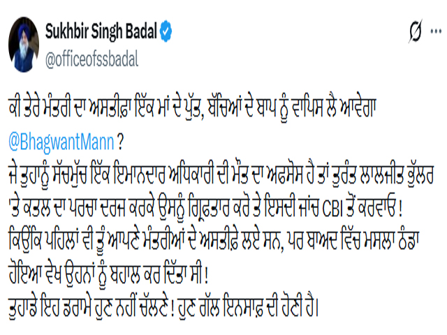 ਚੰਡੀਗੜ੍ਹ, 21 ਅਪ੍ਰੈਲ- ਅੰਮ੍ਰਿਤਸਰ ਵਿਚ ਵੇਅਰ ਹਾਊਸ ਦੇ ਮੈਨੇਜਰ ਦੇ ਖੁਦਕੁਸ਼ੀ ਮਾਮਲੇ ਉਤੇ ਸੁਖਬੀਰ ਬਾਦਲ ਦਾ ਟਵੀਟ ਸਾਹਮਣੇ ਆਇਆ ਹੈ। ਸੁਖਬੀਰ ਸਿੰਘ ਬਾਦਲ ਨੇ ਟਵੀਟ ਕਰਕੇ ਆਪ ਸਰਕਾਰ ਉਤੇ ਤੰਜ ਕੱਸਦਿਆਂ ਕਿਹਾ ਹੈ ਕਿ ਕੀ ਲਾਲਜੀਤ ਭੁੱਲਰ ਦਾ ਅਸਤੀਫਾ ਇਕ ਮਾਂ ਦੇ ਪੁੱਤ ਤੇ ਬੱਚਿਆਂ ਦੇ ਬਾਪ ਨੂੰ ਵਾਪਸ ਲੈ ਕੇ ਆ ਸਕੇਗਾ।