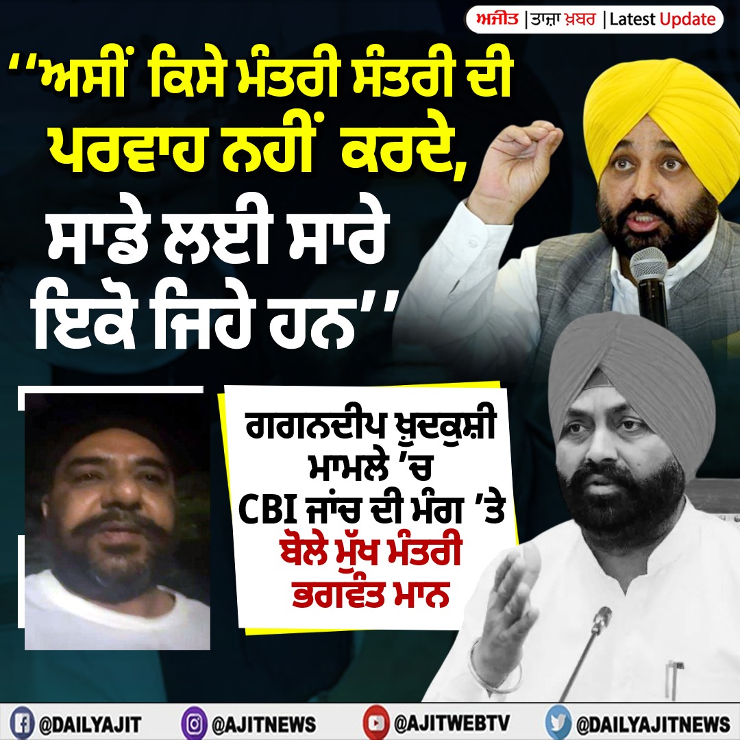 ਚੰਡੀਗੜ੍ਹ, 24 ਮਾਰਚ- ਪੰਜਾਬ ਦੇ ਮੁੱਖ ਮੰਤਰੀ ਭਗਵੰਤ ਮਾਨ ਅੱਜ ਆਪਣੇ ਚੰਡੀਗੜ੍ਹ ਨਿਵਾਸ ਸਥਾਨ 'ਤੇ ਪ੍ਰੈਸ ਕਾਨਫ਼ਰੰਸ ਕਰਨਗੇ। ਗੁਦਾਮ ਅਧਿਕਾਰੀ ਦੀ ਖੁਦਕੁਸ਼ੀ ਮਾਮਲੇ ਵਿਚ ਸਾਬਕਾ ਮੰਤਰੀ ਅਤੇ ਵਿਧਾਇਕ ਲਾਲਜੀਤ ਸਿੰਘ ਭੁੱਲਰ ਦੀ ਗ੍ਰਿਫ਼ਤਾਰੀ ਤੋਂ ਬਾਅਦ ਇਹ ਮੁੱਖ ਮੰਤਰੀ ਦੀ ਪਹਿਲੀ ਪ੍ਰੈਸ ਕਾਨਫਰੰਸ ਹੈ।