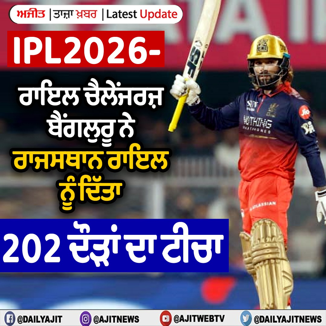 ਆਈ ਪੀ ਐੱਲ 2026- ਬੰਗਲੁਰੂ ਦੇ ਰਾਜਸਥਾਨ ਖਿਲਾਫ 3 ਓਵਰਾਂ ਤੋਂ ਬਾਅਦ 45/2